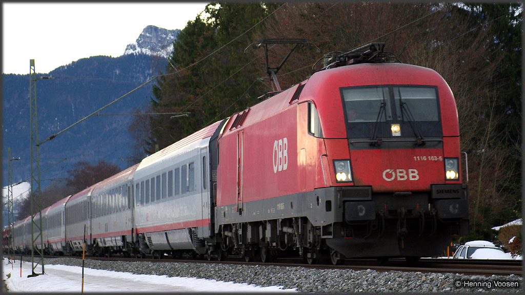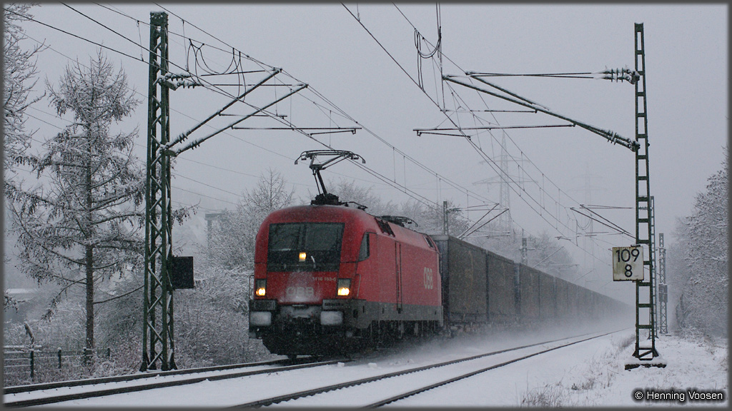 Prien (Chiemsee), 23.12.2010 am Tag vor Weihnachten ist der Taurus zwischen Bernau und Prien / Chiemsee mit einem Autoreisezug unterwegs... Siegen (Rinsenau), 20.12.2011 ... und fast auf den Tag genau ein Jahr später zieht er den aus der Türkei kommenden MegaCombi durch Siegen in Richtung Köln |